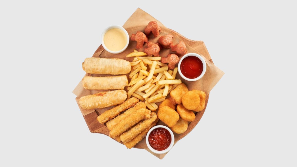nugetky, hranolky, sýrové tyčinky, rybí tyčinky, smažené mini párky, kečup, bbq a sýrová omáčka 610/30/30/30 g