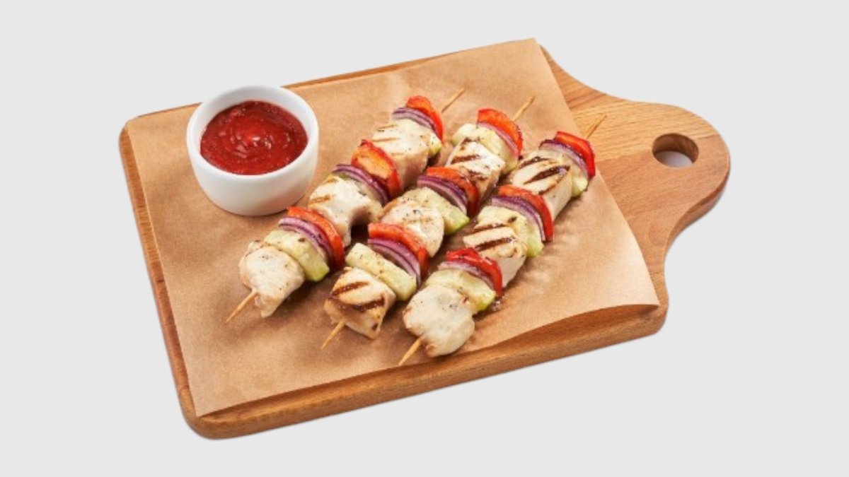 375 g. Mleté kuřecí maso na špejli s mozzarellou, grilované dozlatova. Podává se s pečenými bramborami, nakládanou cibulí, cherry rajčaty, listem salátu a tatarskou omáčkou.