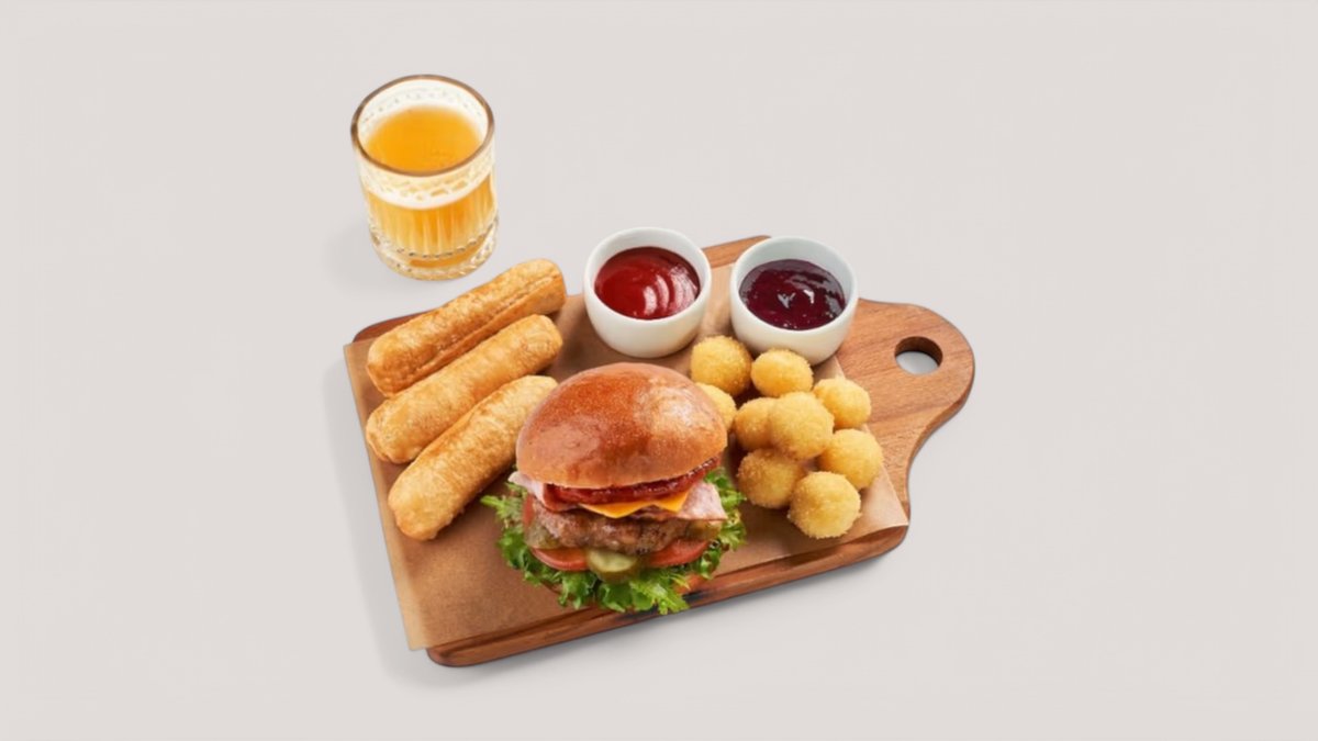 cheeseburger, sýrové tyčinky, bramborové krokety, kečup, brusinková omáčka, cake pops, nápoj 180/180/150/30/40/200 g