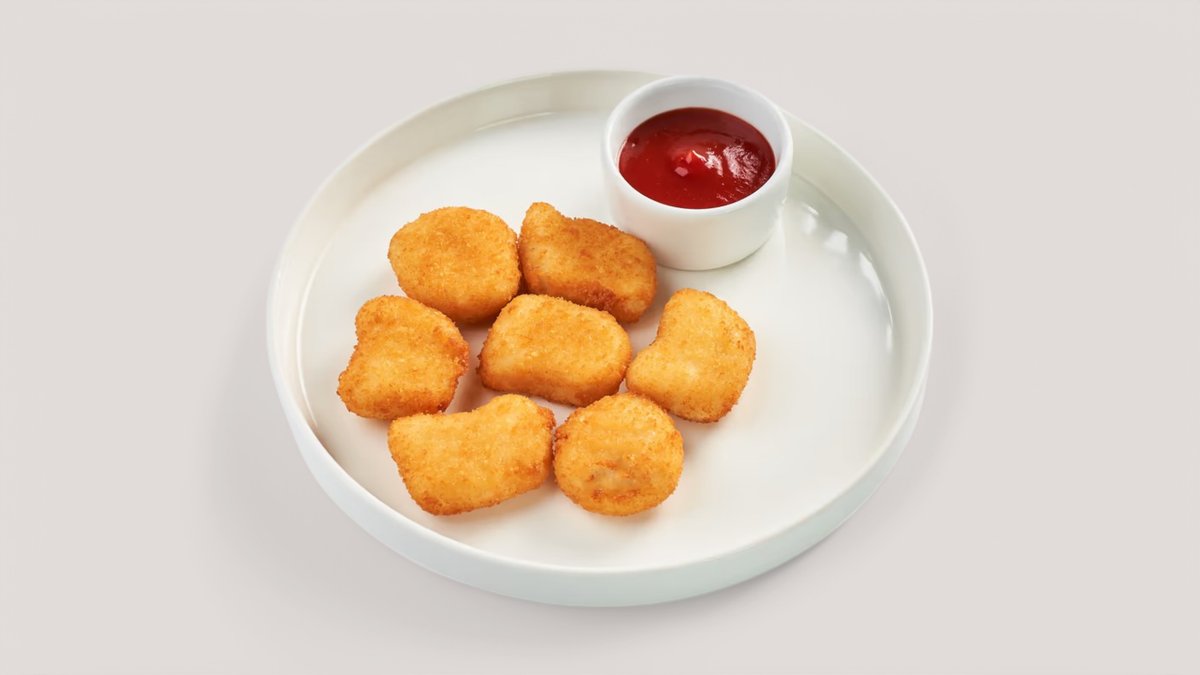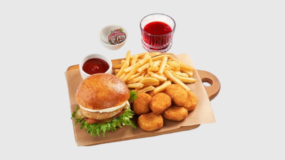 chickenburger, hranolky, nugetky, kečup, cake pops, nápoj 195/150/150/30/40/200 g