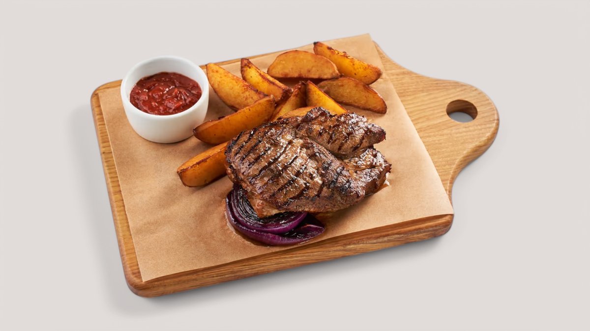 vepřový steak, americké brambory, červená cibule, bbq omáčka 150/130/30 g