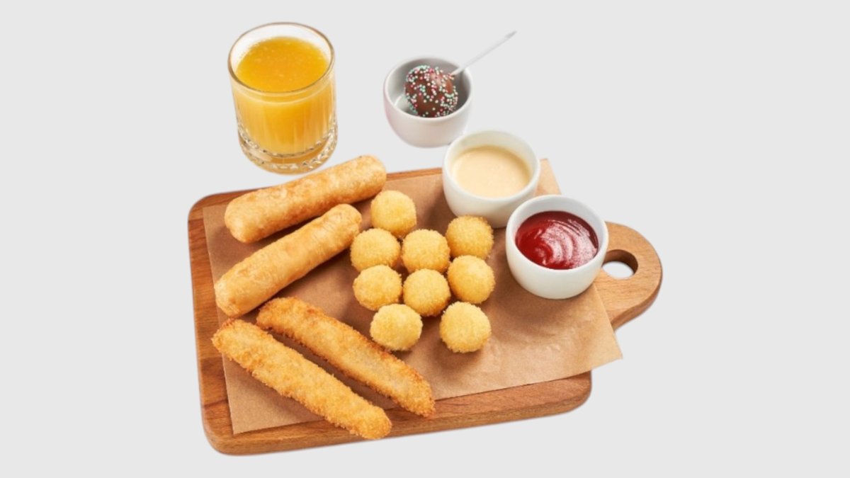 sýrové tyčinky, kuřecí tyčinky, bramborové krokety, kečup, sýrová omáčka, cake pops, nápoj 120/50/100/60/40/200 g