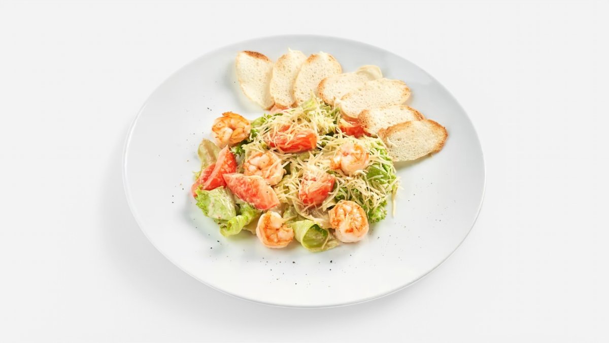 Krevety, rajčata, směs listů salátu, pšeničné krutony, parmazán. Podáváme s dresinkem Caesar. 200 g.