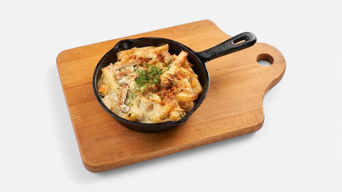 Hovězí maso opečené s brambory a cibulí, s máslem, zakysanou smetanou a smetanovým sýrem. Podáváme na pánvi s osmaženou cibulkou a čerstvými bylinkami. 320 g