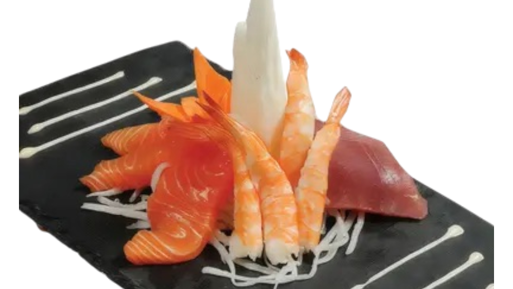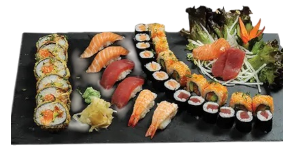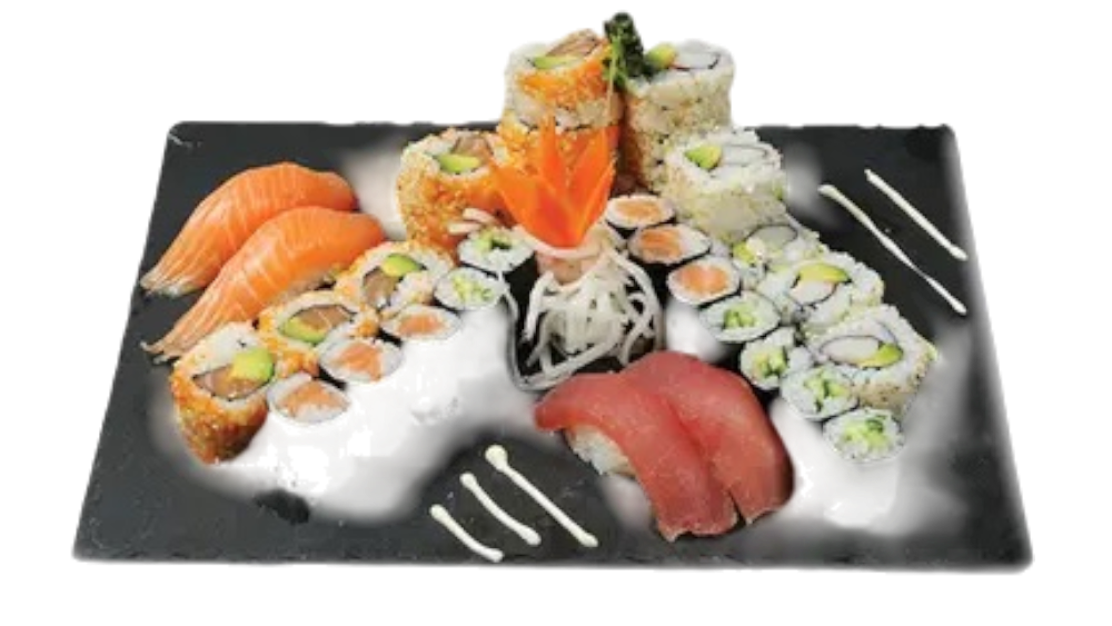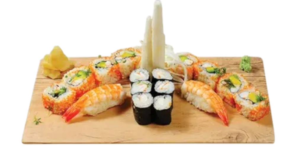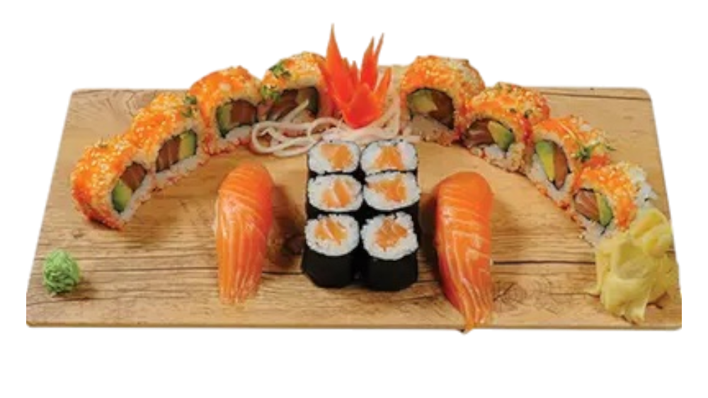 8x California losos s avokádem, 6x smažené futo, 6x maki losos + maki tuňák, 6x nigiri (2x losos, 2x tuňák, 2x kreveta), 4x sashimi (2x losos, 2x tuňák).