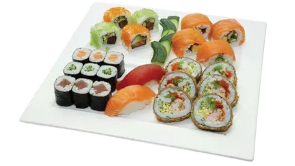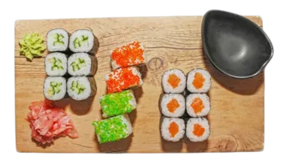8x California losos s avokádem, 8x California krab s avokádem, 6x maki losos + 6x maki okurka, 4x nigiri (2x losos, 2x tuňák)