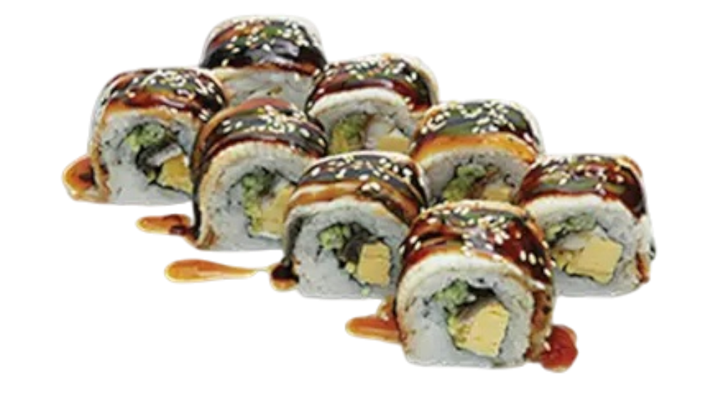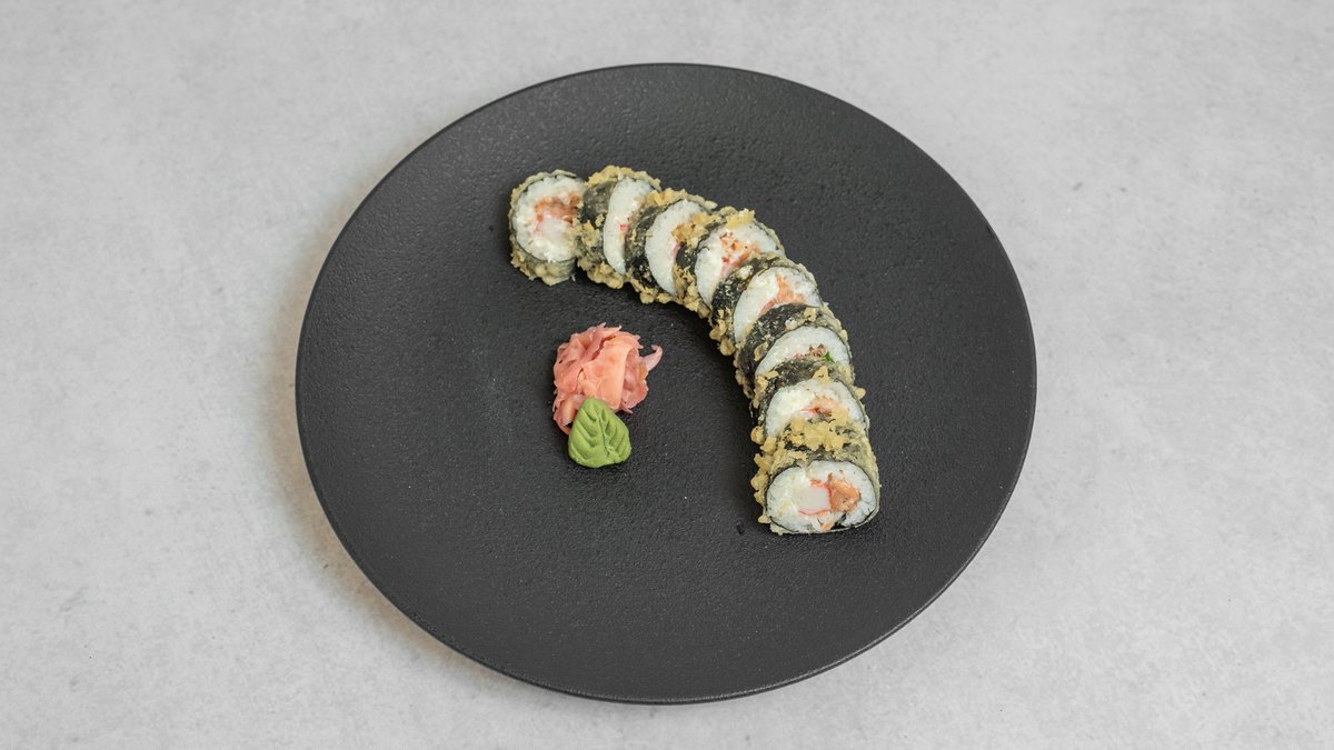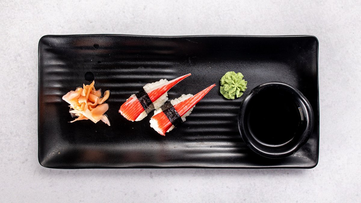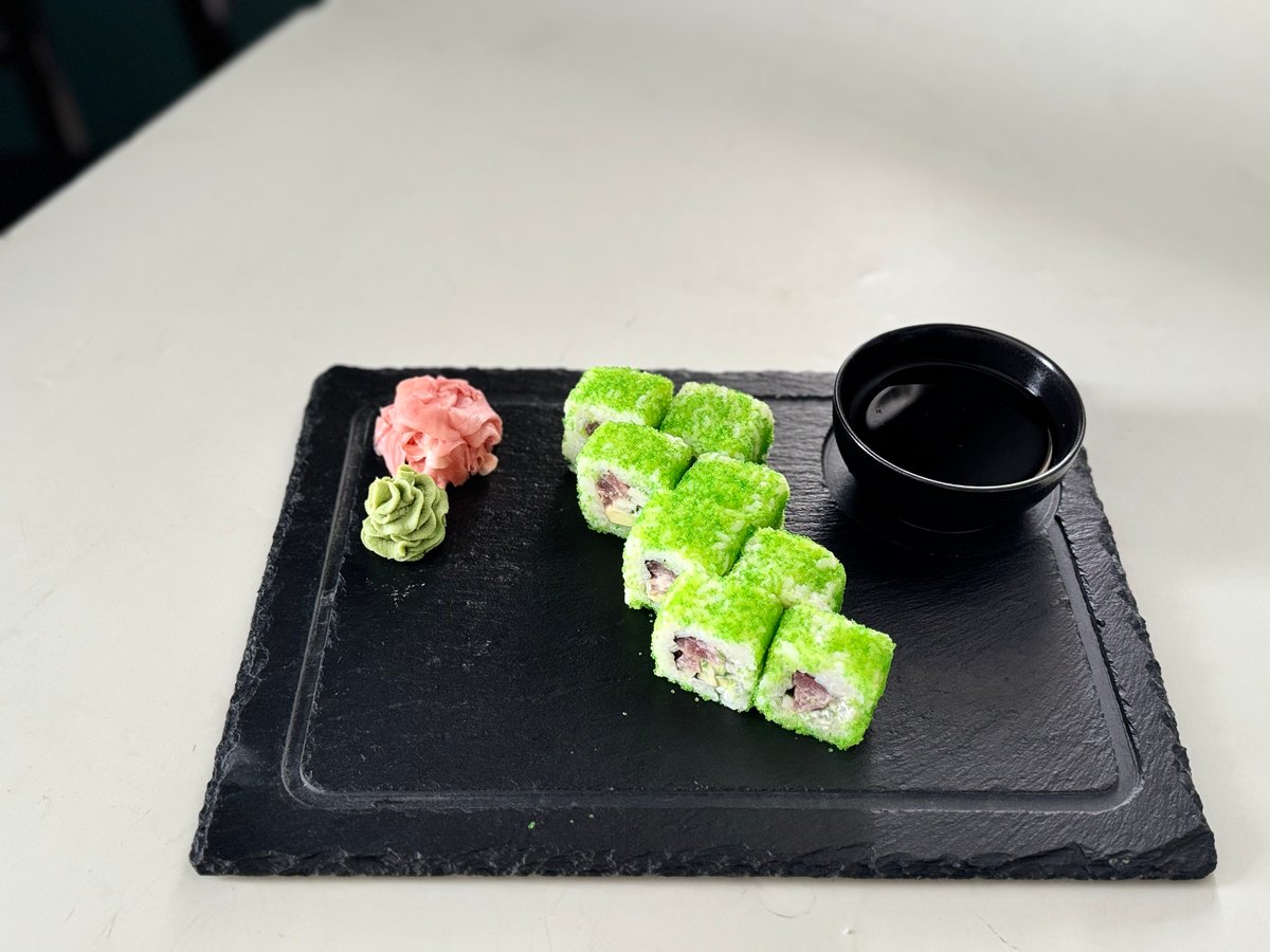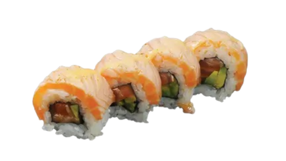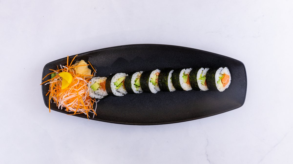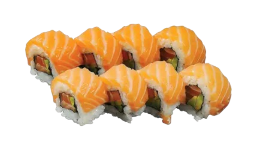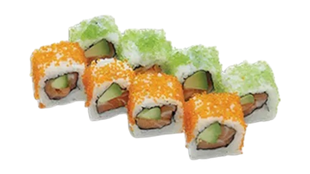 Losos, krabí tyčinky, kaviár, okurka, avokádo, omáčka.