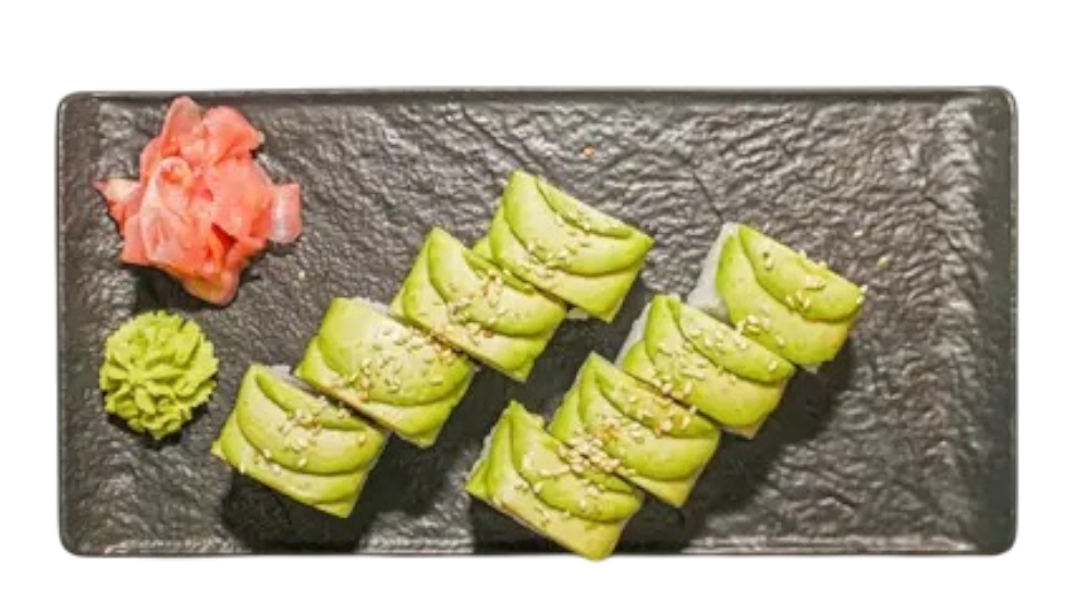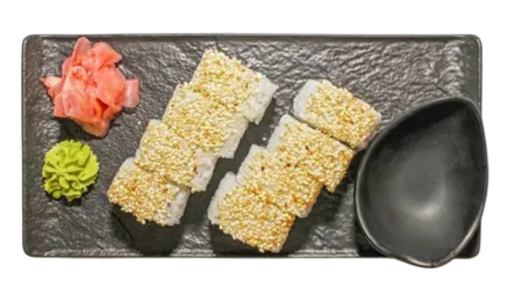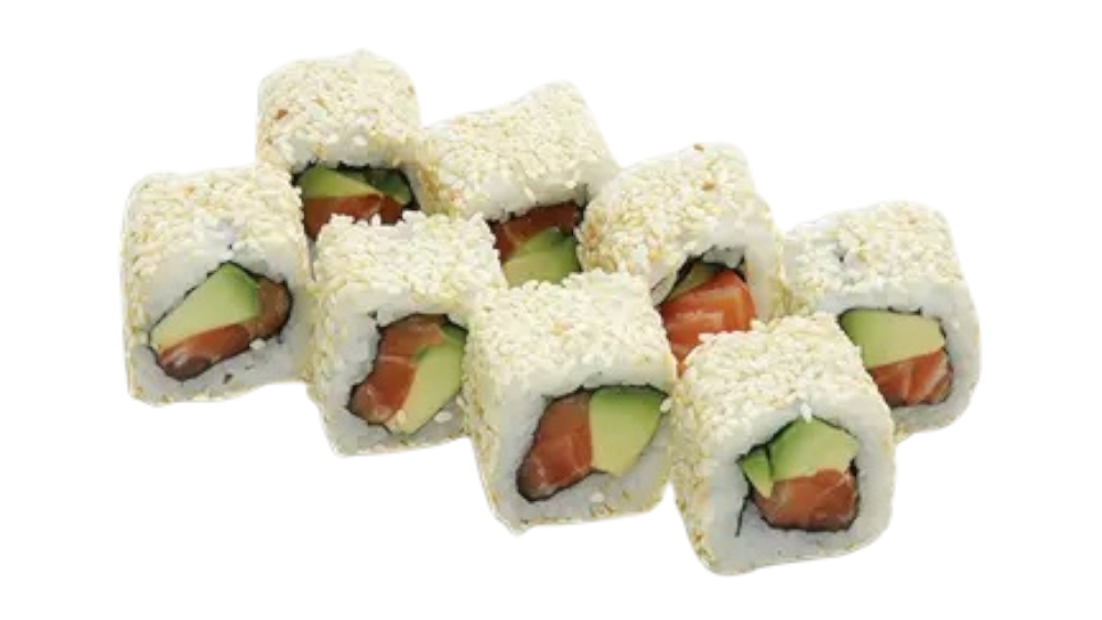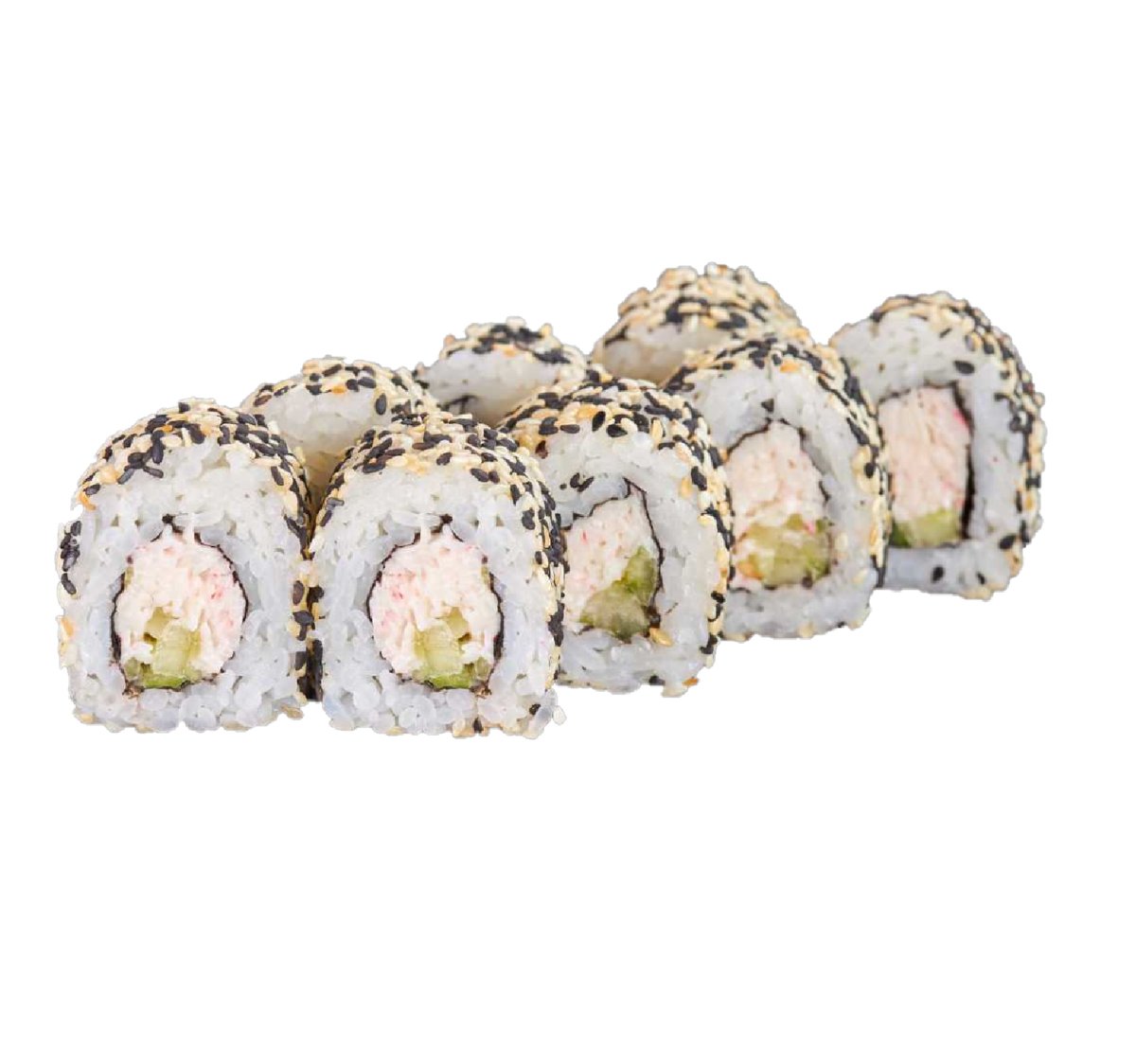 Okurka, avokádo, losos, krabí tyčinky, kreveta, sezam.