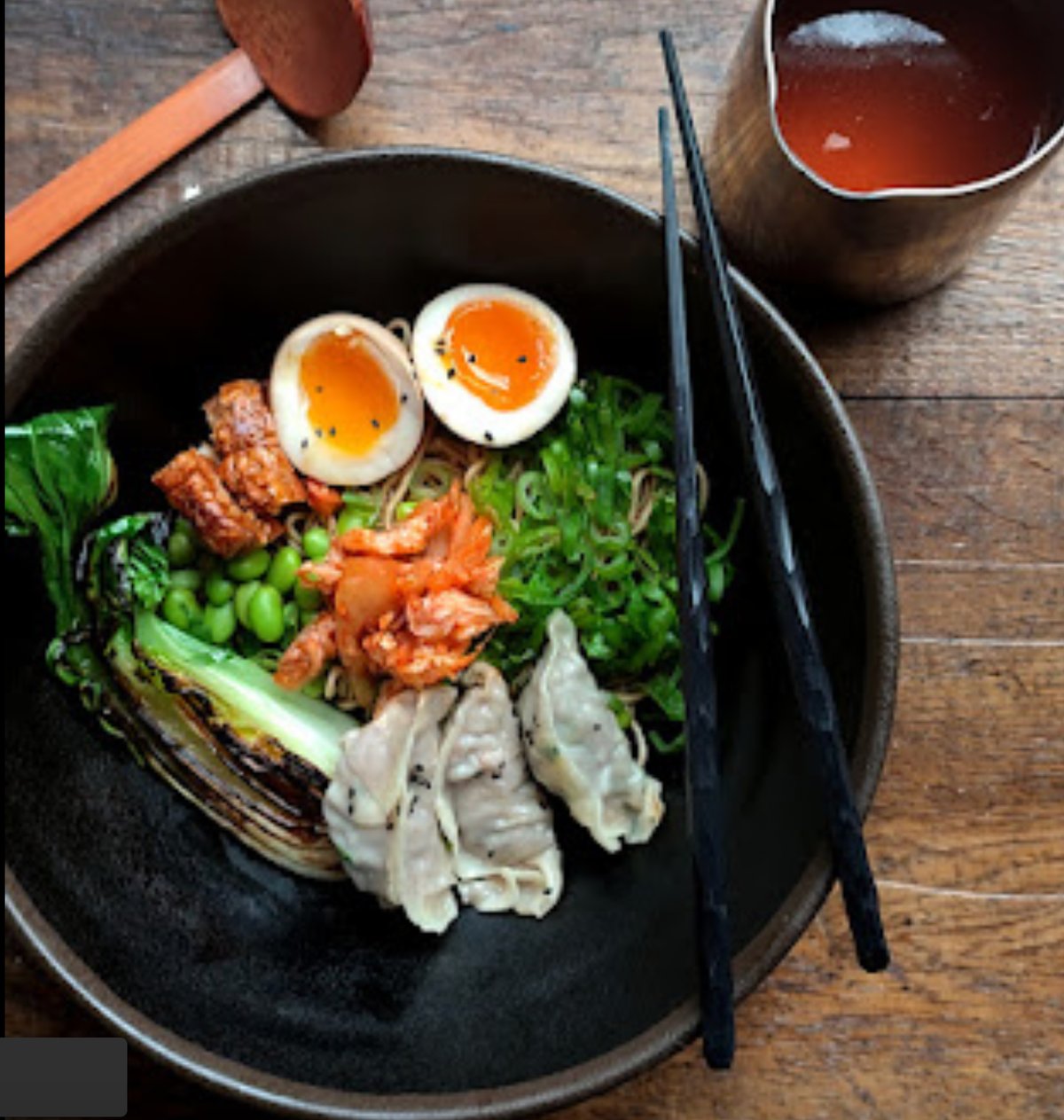 kimchi vývar, pšeničné nudle, 3 ks zeleninové gyoza knedlíčky, nakládané vejce, křupavé tofu, jarní cibulka, bok choy, koriandr, domácí kimchi