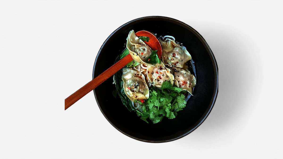 kuřecí vývar, dashi, pšeničné nudle, 5 ks vepřových wonton knedlíčků, bok choy, koriandr, domácí chilli olej, jarní cibulka