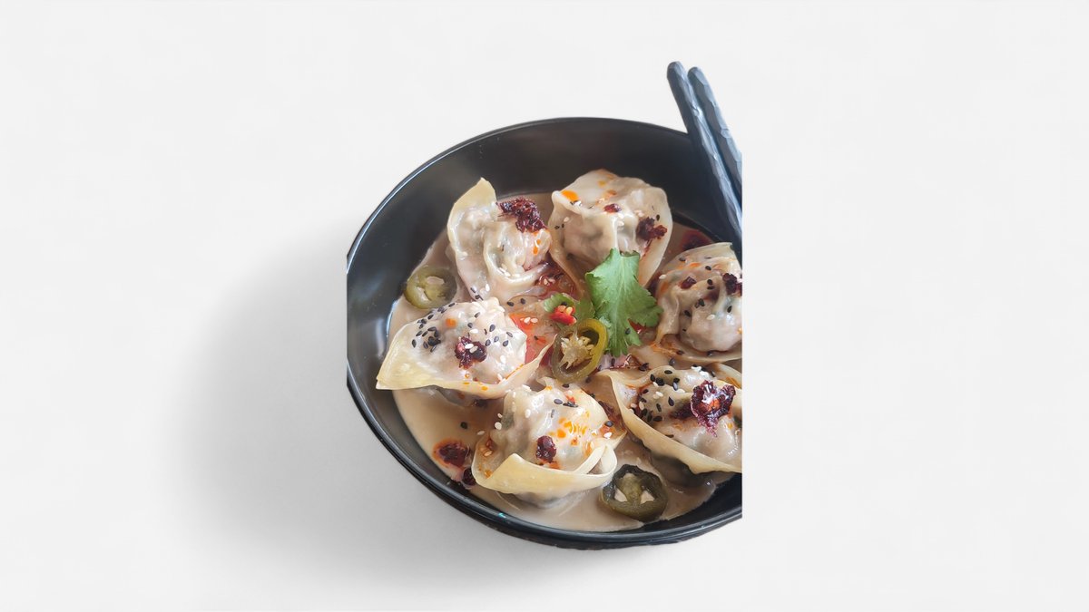 vepřovo kuřecí krémový vývar, sečuánský olej, pšeničné nudle, vepřové wonton knedlíčky, koriandr, jarní cibulka, chilli, nakládané vejce, sezamová semínka