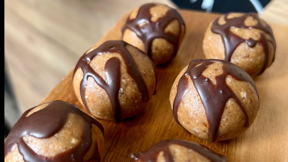Veganské proteinové kuličky s domácím arašídovým máslem, datlemi, vanilkovým proteinovým práškem, ovesnou moukou a špetkou soli. Přelité hořkou čokoládou s trochou kokosového oleje. 17% protein