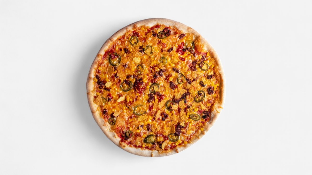 Tomaty speciál, sýr, pikantní salám, červené fazole, kukuřice, jalapeños, chipotle, čedar, kukuřičné nachos