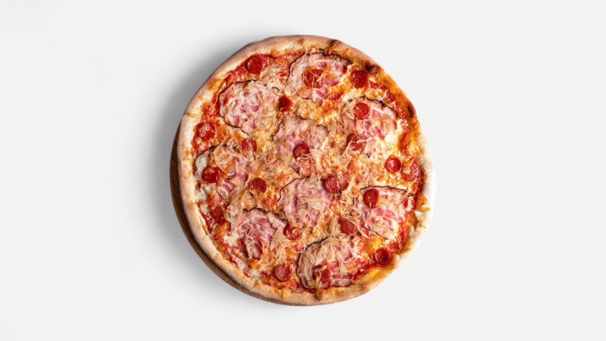 tomaty speciál, sýr, slanina, pražská šunka, tyrolská sušená kýta, italský pikantní salám, oregano