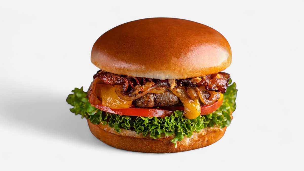 Čedar, plátky rajčat, ledový salát, čerstvá červená cibule, grilovaná slanina, smažená cibulka, 100% vepřové maso, americký dresing + hranolky + nápoj 0,33l