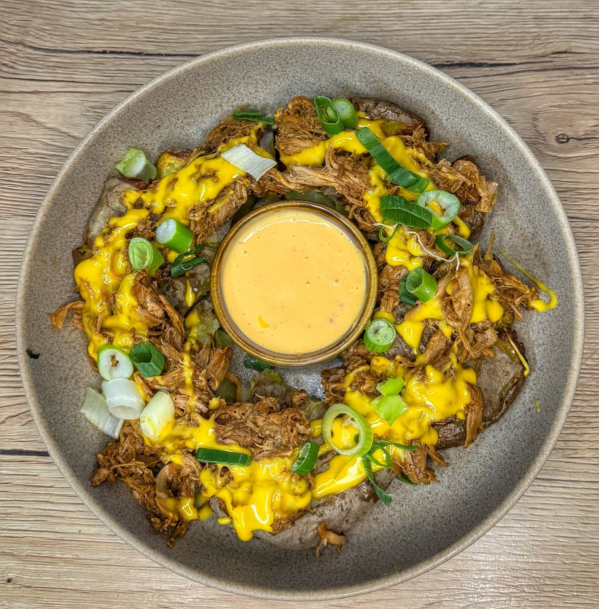 škvarečky z uzeného špeku, jarní cibulka, opečený kváskov