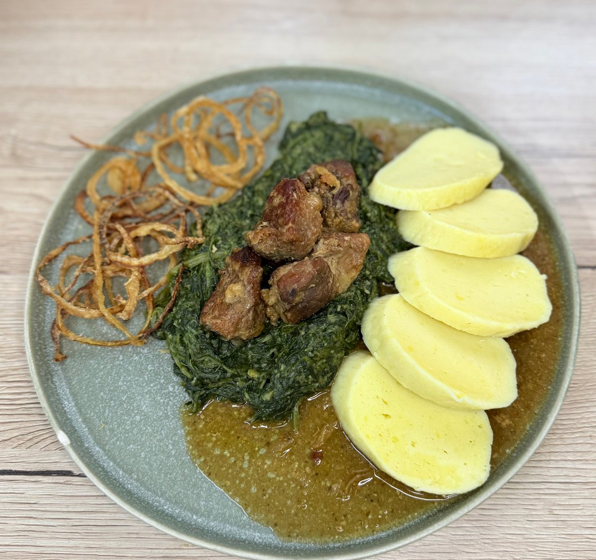se dvěma zastřenými vejci a žemlovým knedlíkem, koprová olej
