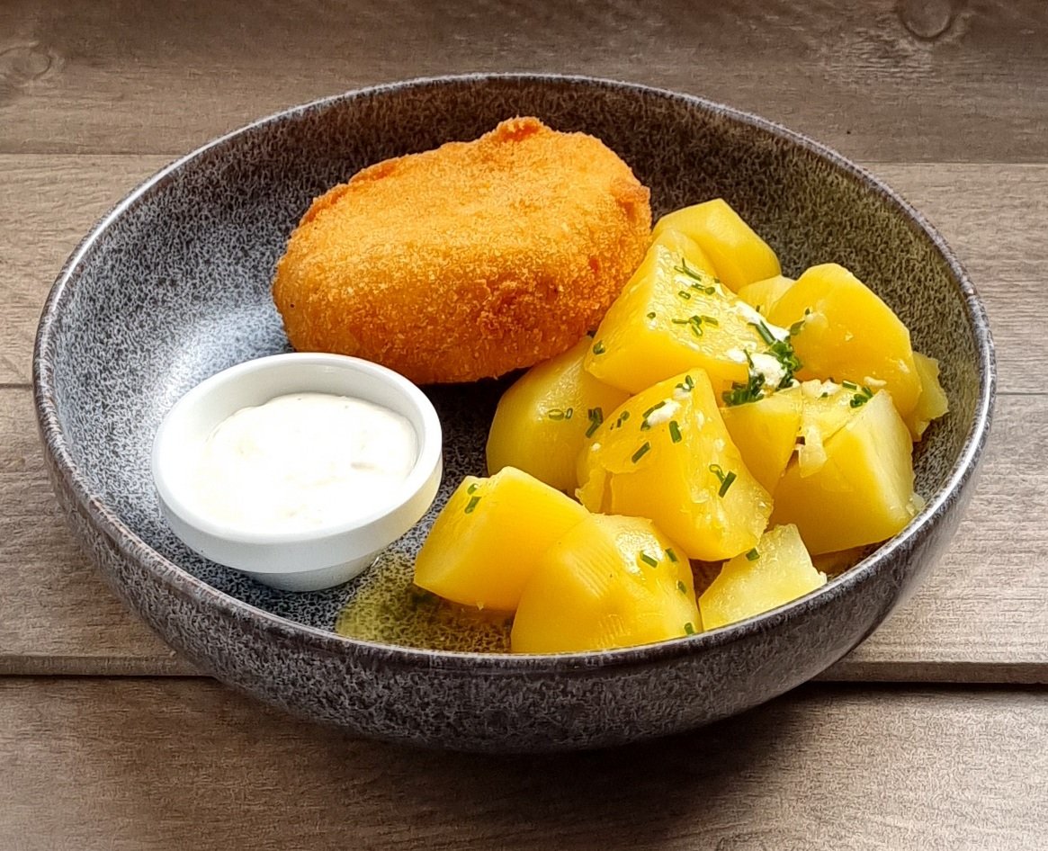v panko strouhance, marinované v podmáslí, bramborová kaše, okurkový salát