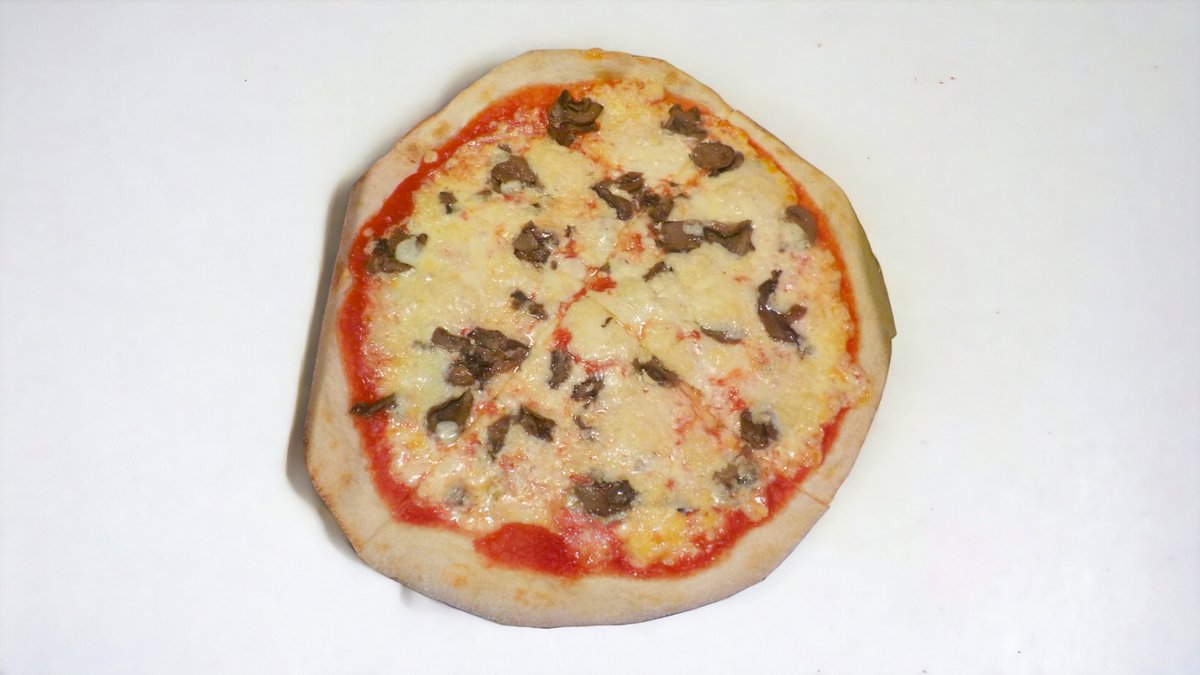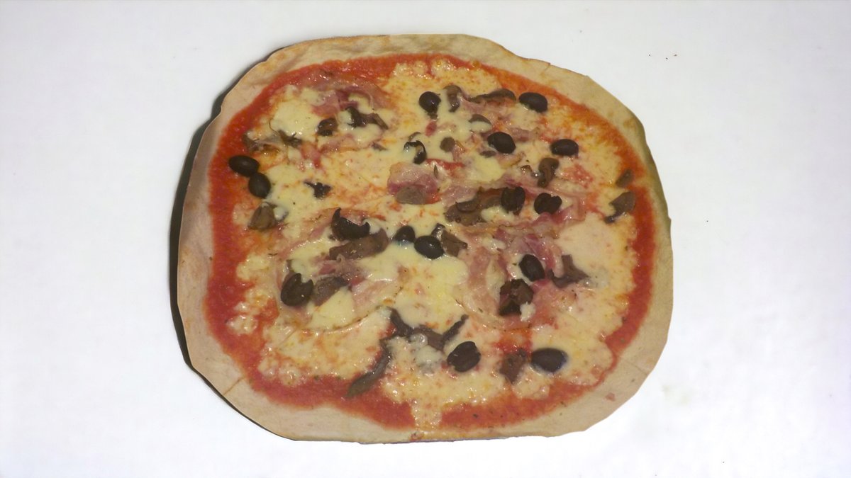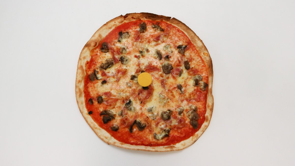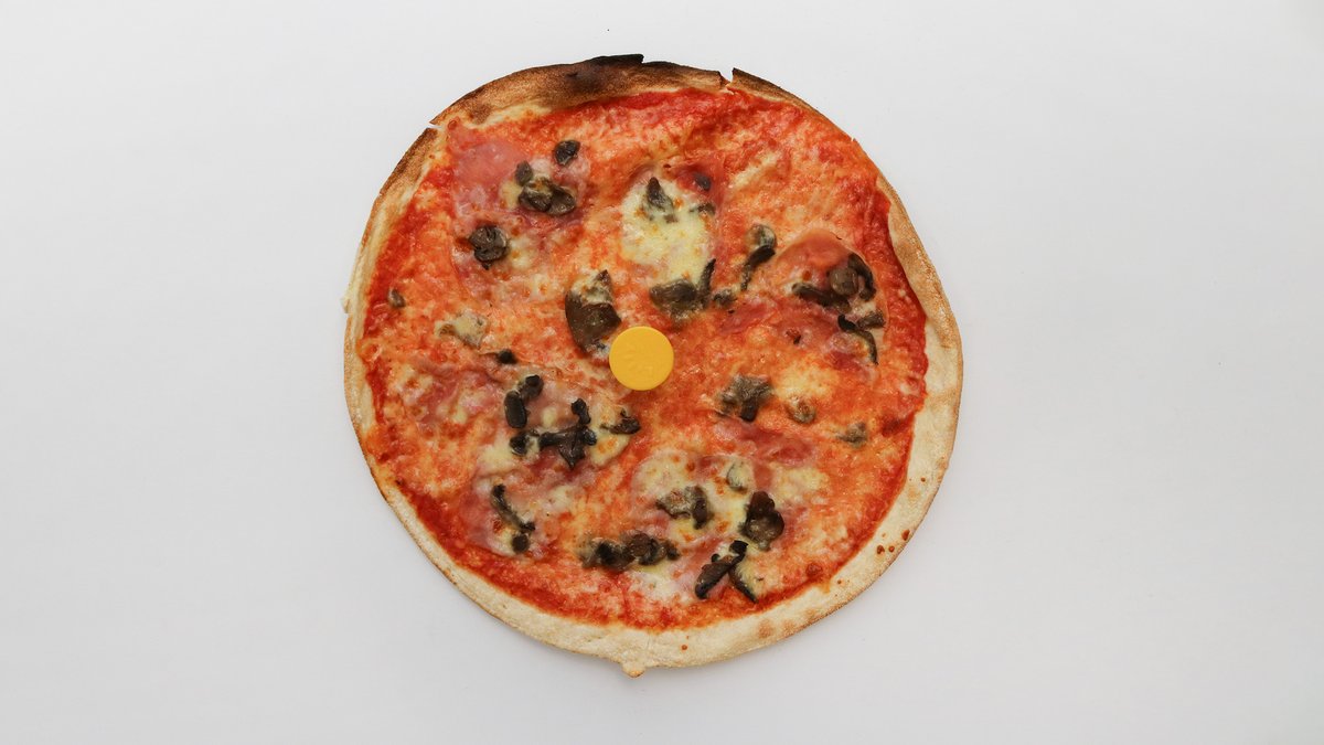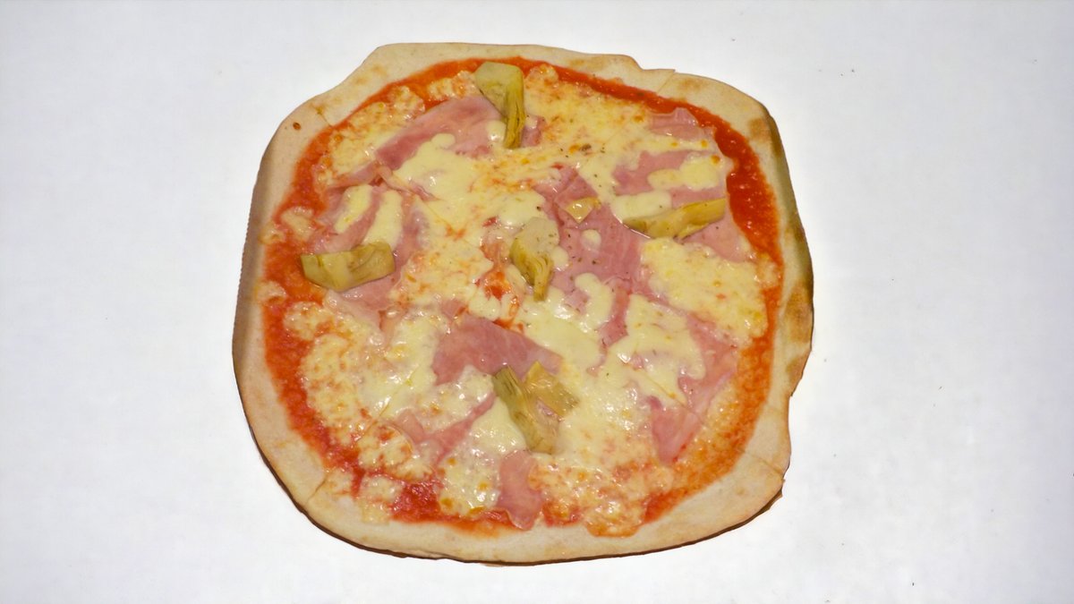 rajská drcená omáčka, italská mozzarella, 1/4 italská vařená šunka od kosti, 1/4 černé olivy, 1/4 nakládané žampiony v oleji s bylinkami, 1/4 artyčoky, oregano (1, 2)