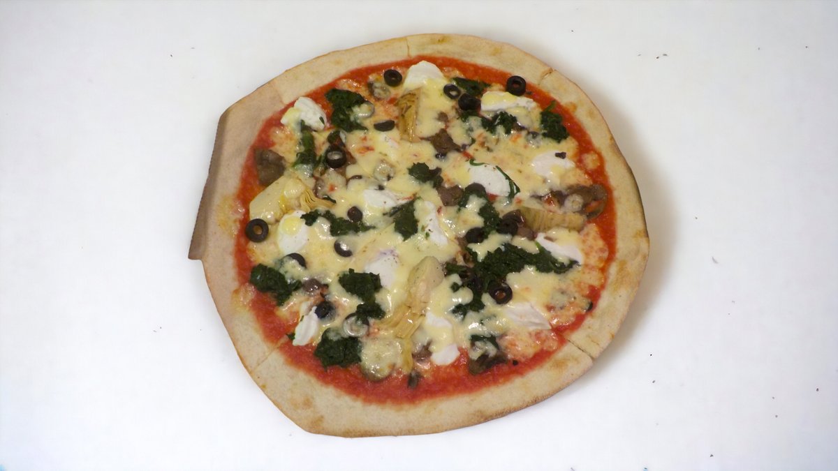 rajská drcená omáčka, italská mozzarella, sušená rajčata, listový špenát a černé olivy, oregáno.