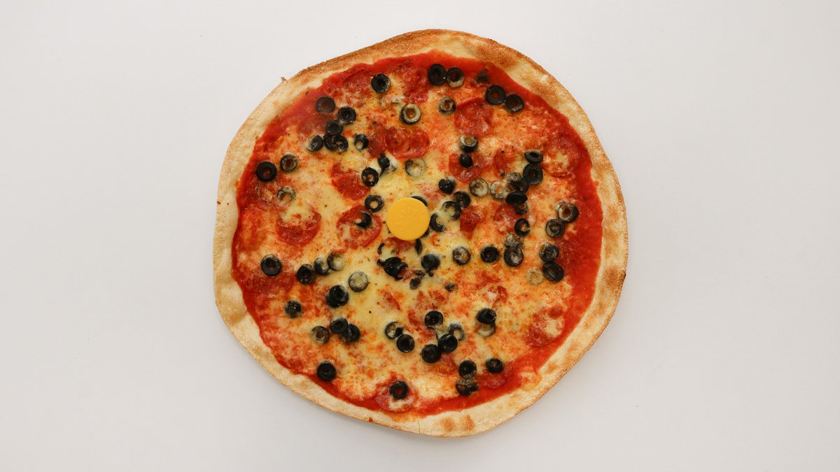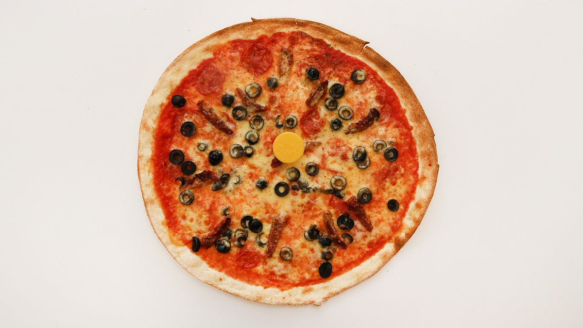 Sušená rajčata, salame piccante a olivy cca 33cm.TENKÉ TĚSTO PRO 1-2 DOSPĚLÉ-