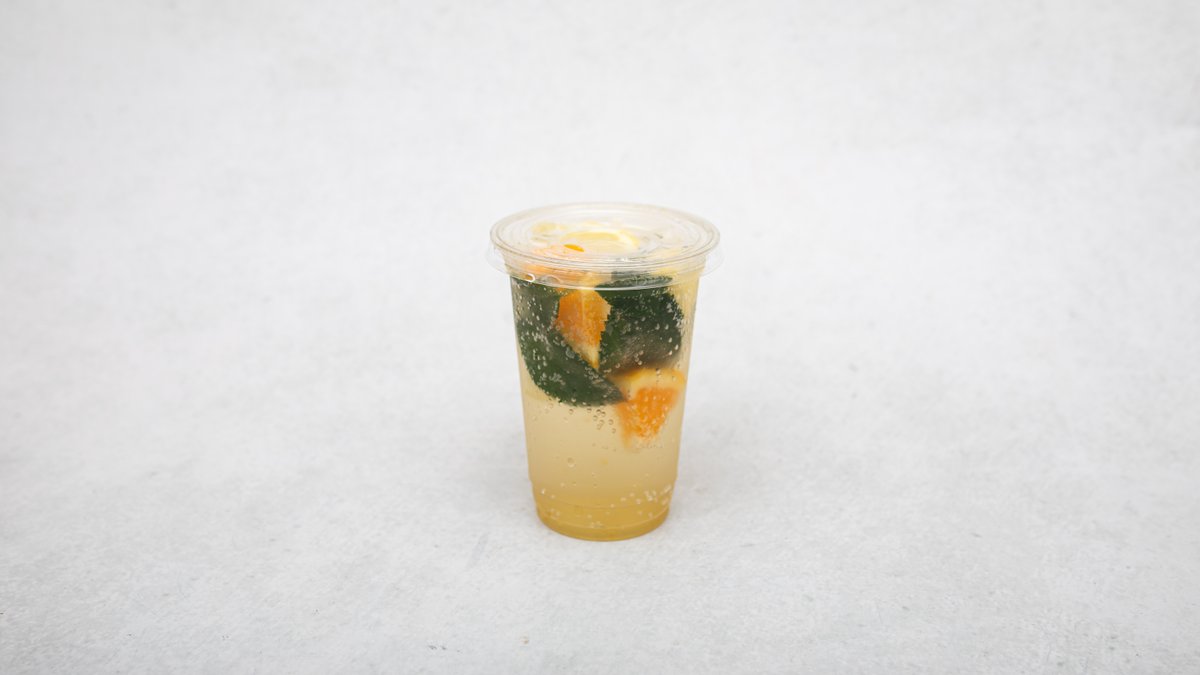 řecký pita chleba plněný kuřecím gyros masem, cibulí, okurkou, rajčaty a hranolky, s omáčkou uvnitř tzatziki a navrchu kečup a hořčice
