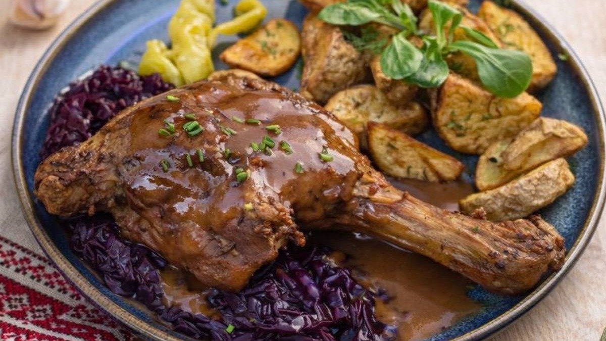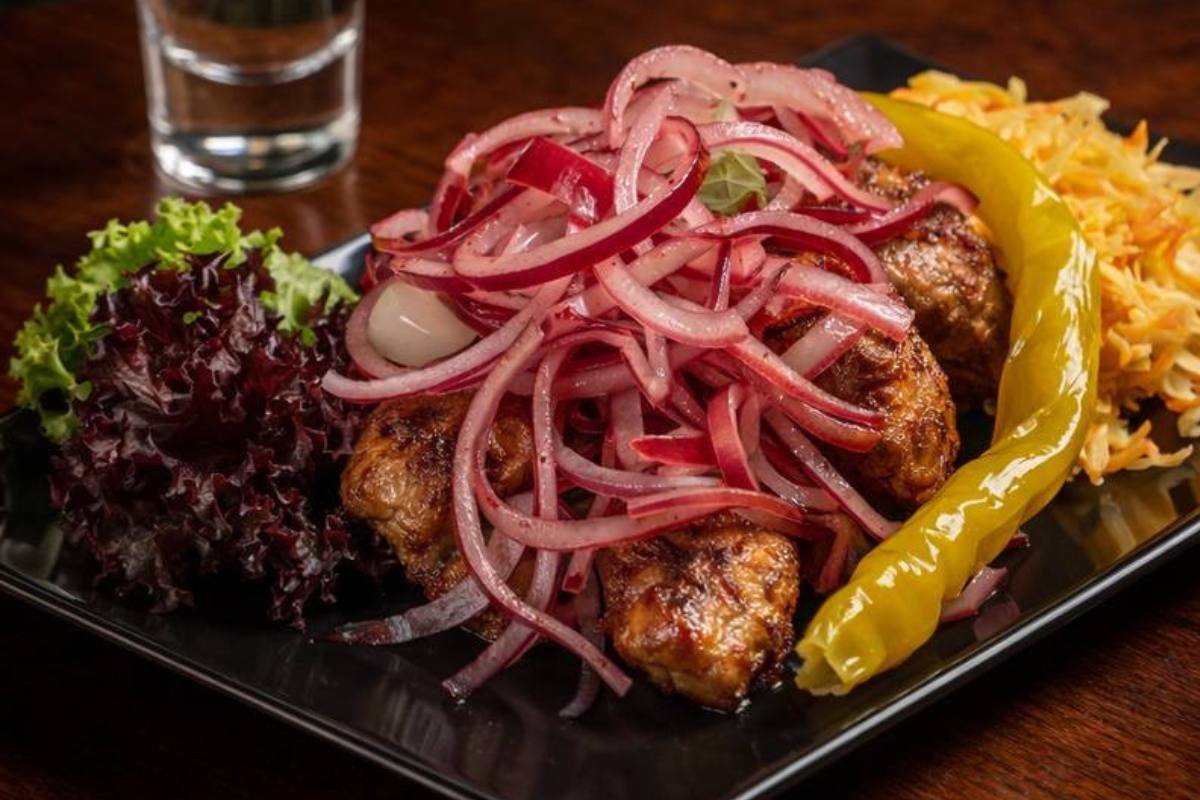 Борщ, сметана, грінки, сало, гірчиця, часник.