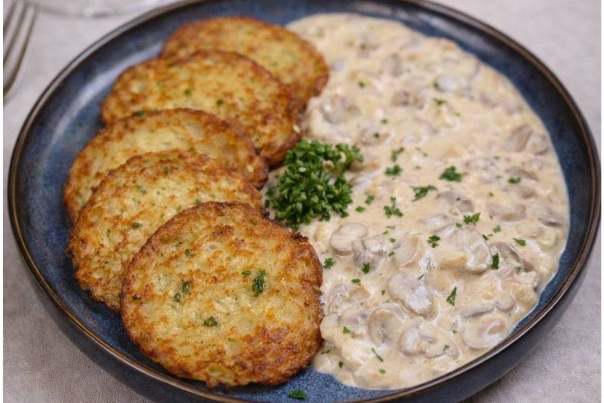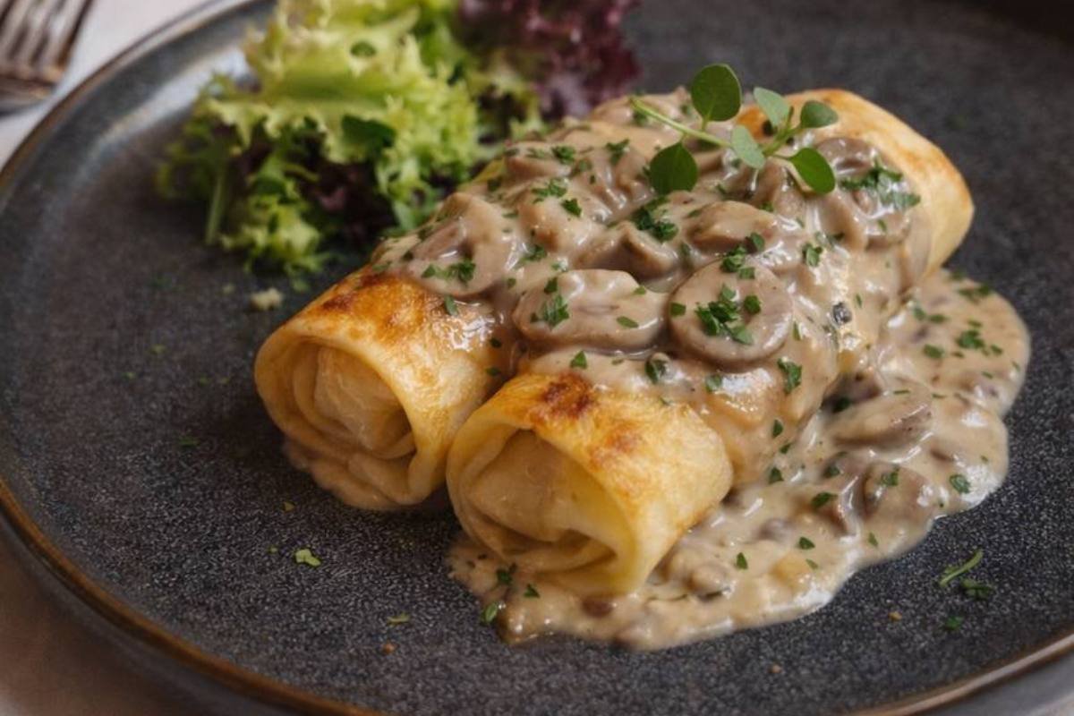 Palačinky plněné masem a sýrem s houbovou omáčkou.