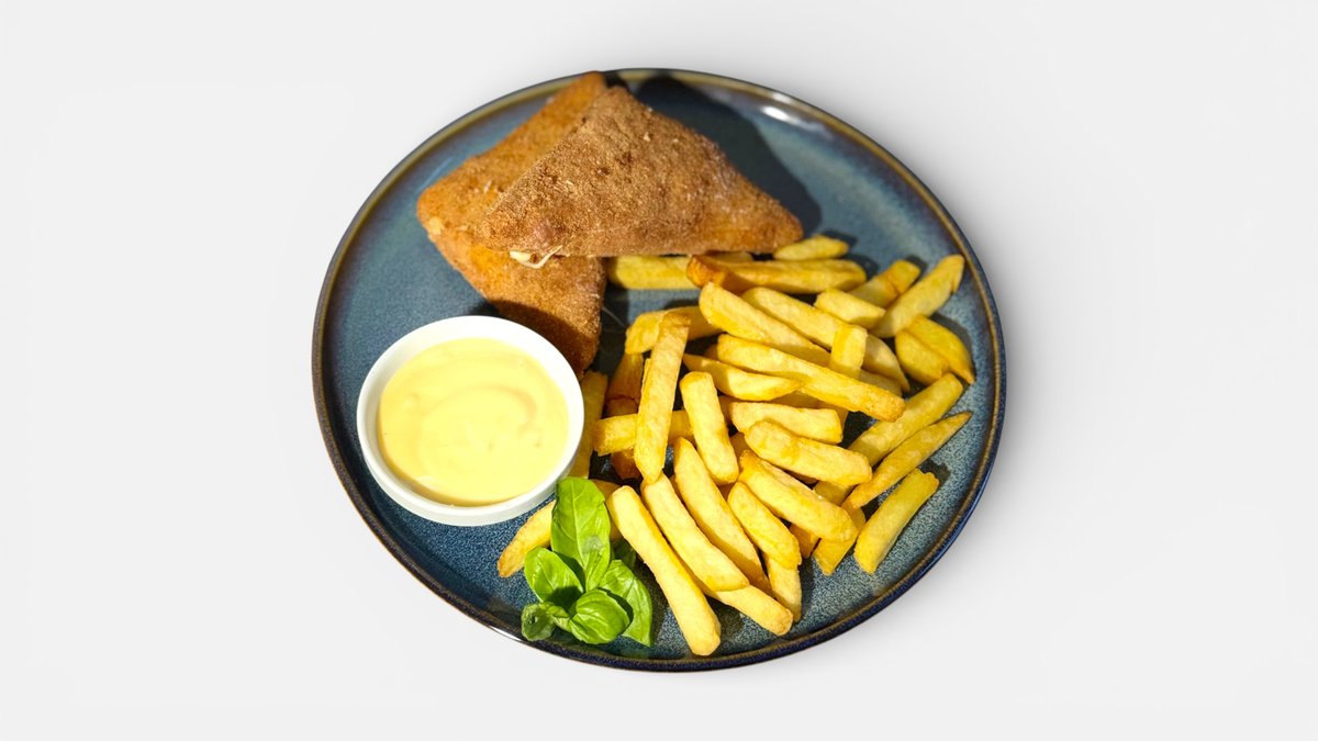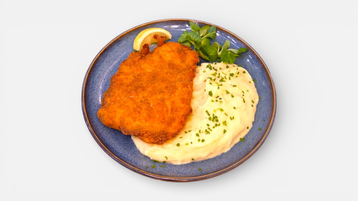 Kuřecí řízek, bramborová kaší nebo hranolky, citron