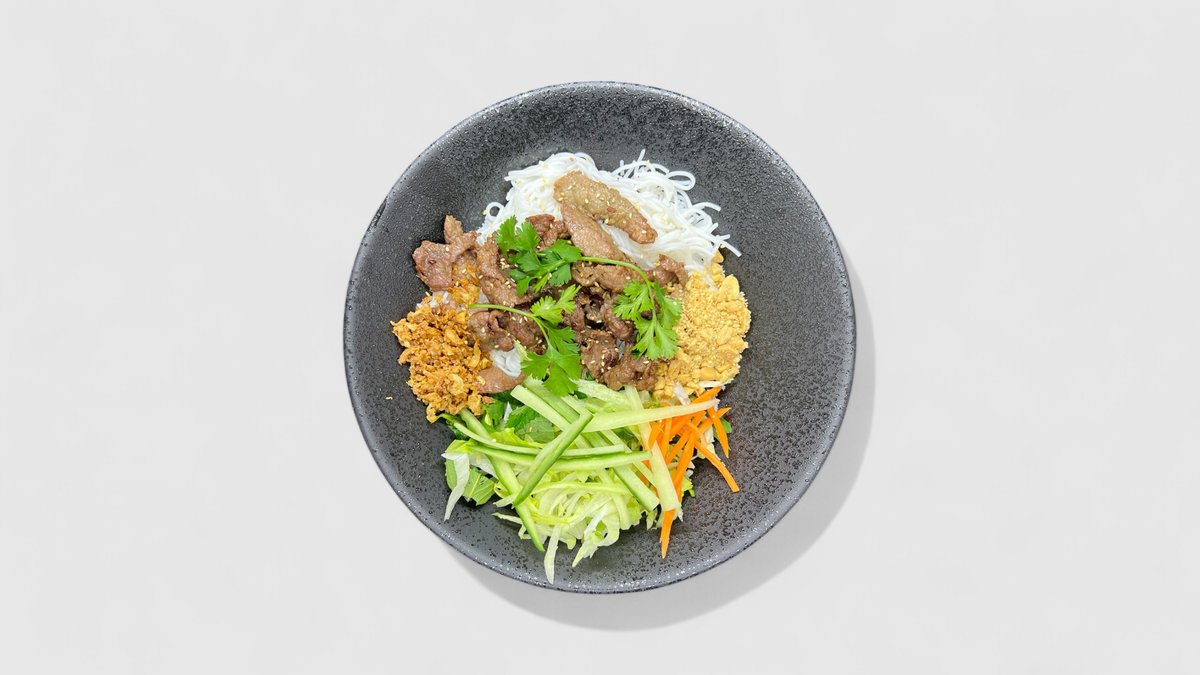 bún nudle s restovaným hovězím, zelenina, zálivka nuoc cham