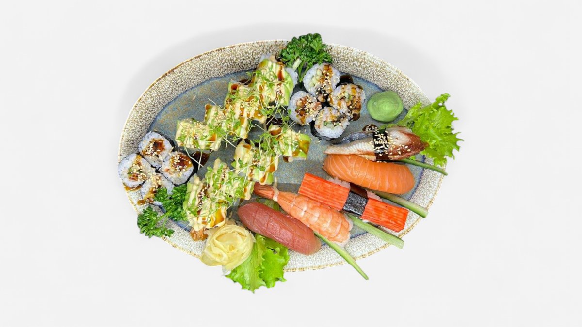 8ks california, 5ks nigiri (losos, tuňák, kreveta, úhoř, surimi), 16ks maki (8ks losos, 8ks krevety), sashimi tuňák 4ks