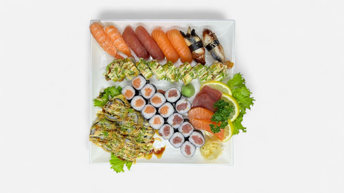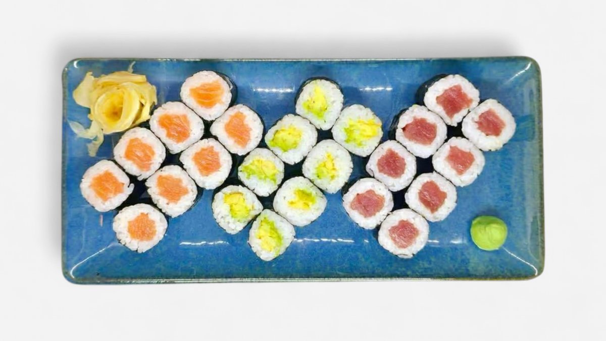 16ks maki losos,16ks maki tuňák, 8ks maki úhoř, 8ks maki krevety, 16ks maki avokádo, 16ks maki okurka, k tomu samozřejmě sojová omáčka, zázvor, wasabi