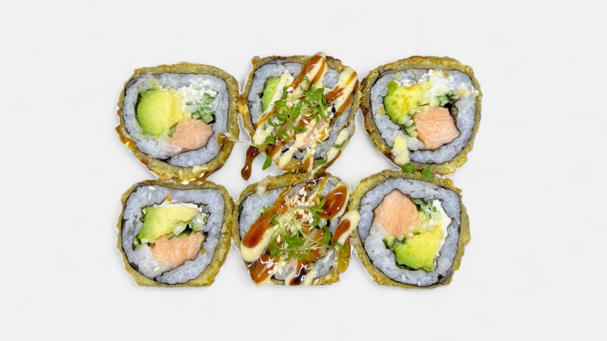 smažená rolka s lososem, avokádem, okurkou, japonská majonéza