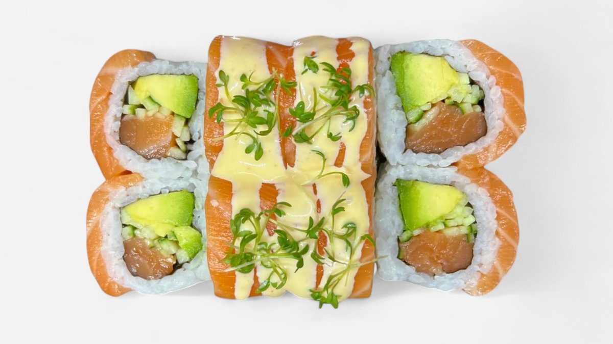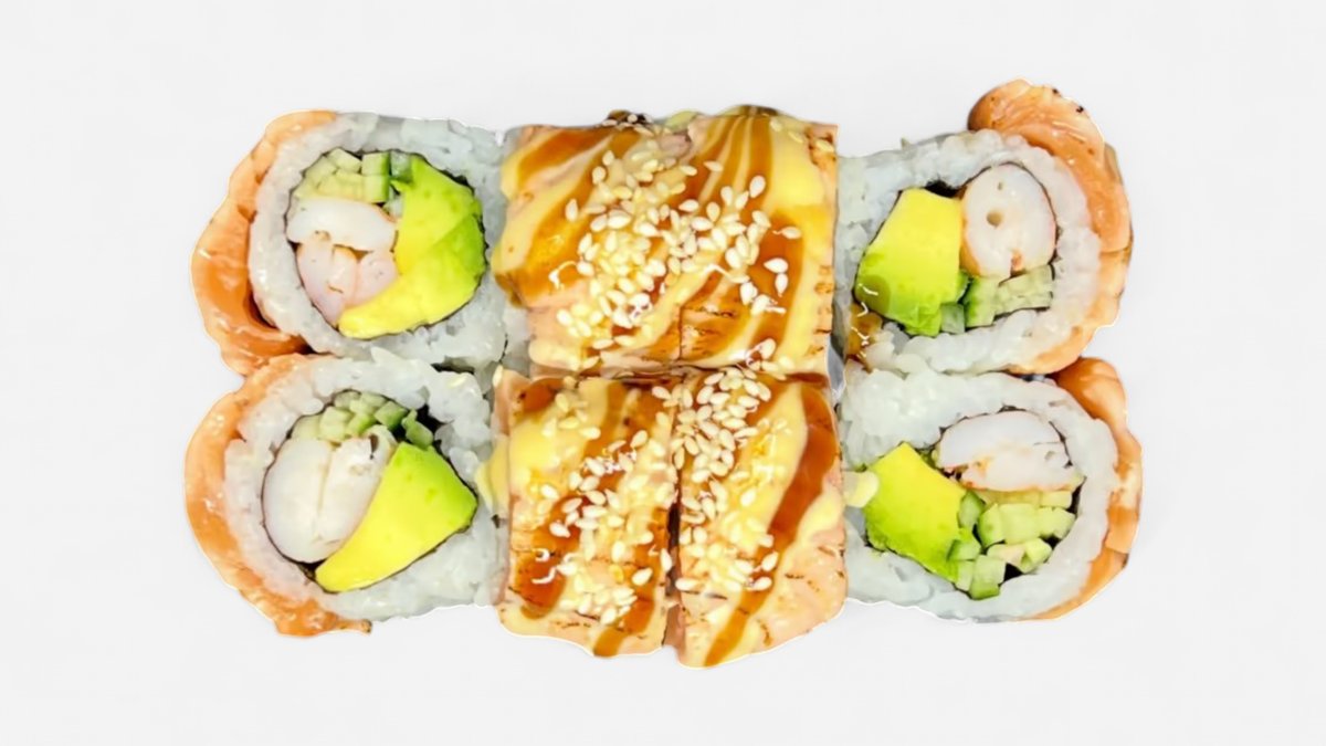 lehce opečený losos na vrchu, uvnitř: kreveta, avokádo
