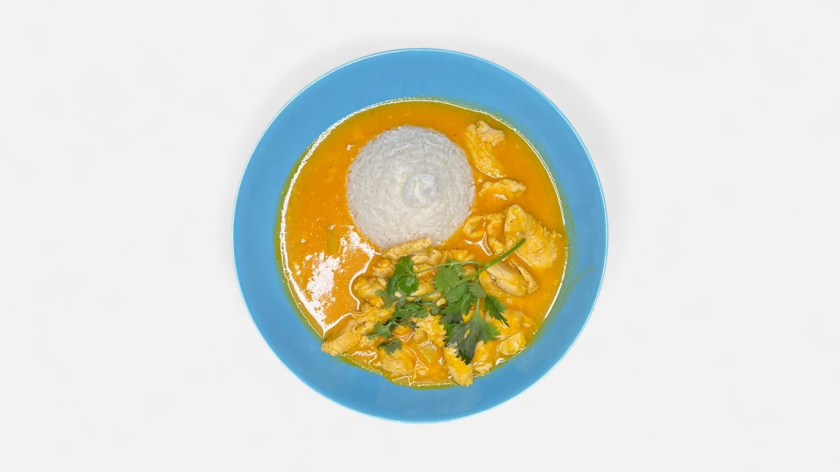 rýže, maso dle výběru s omáčkou z žluté kari pasty a kokosového mléka, zelenina