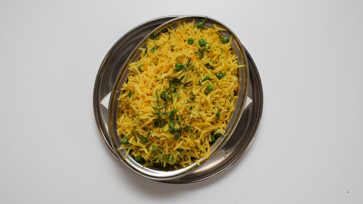 dlouhozrnná dušená rýže Basmati s tumerikem a zeleným hráškem