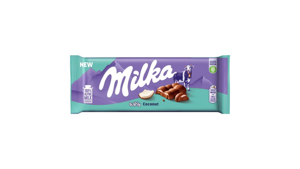 Milka Bubbly Coconut mléčná čokoláda z alpského mléka s porézní kokosovou náplní 97 g