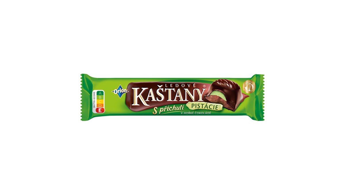 ORION LEDOVÉ KAŠTANY tyčinka v hořké čokoládě s příchutí pistácií a kakaovooříškovou náplní 45g