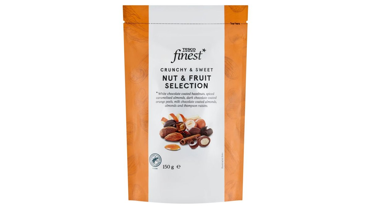 Tesco Finest Směs jader lískových ořechů, mandlí, rozinek a pomerančové kůry v čokoládě 150g