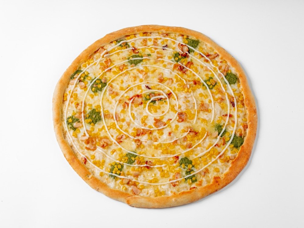 rajčata-sugo / smetana, mozzarela, kuřecí maso, špenát, česnek / kukuřice