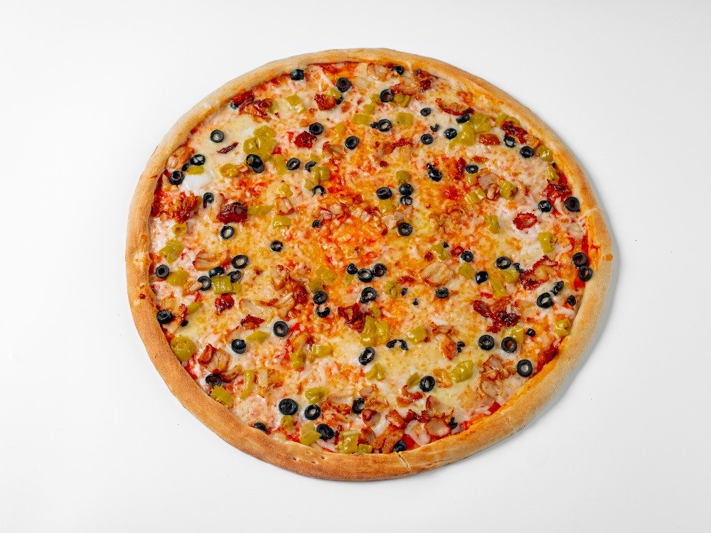 rajčata-sugo, mozzarella, šunka, kuřecí maso, hermelín, uzený sýr, olivy, eidam