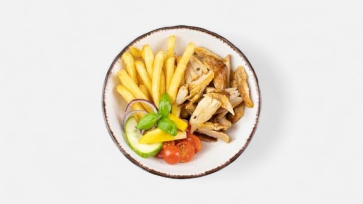 kuřecí maso 150g, hranolky, salát, dresing (3, 7)