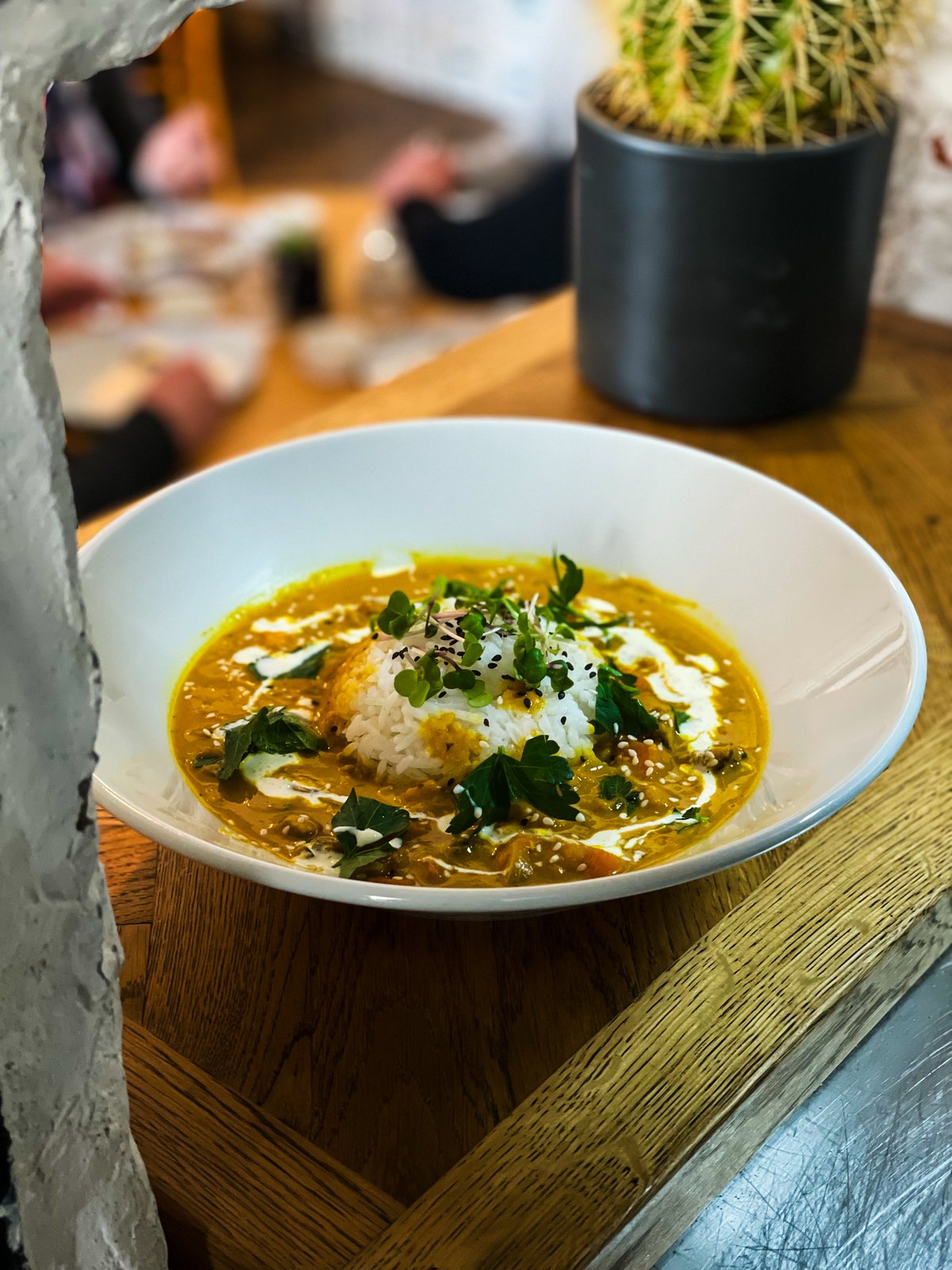 Zeleninové karí s pečenými batáty, květákem, cuketou, paprikou a cizrnou, čočkou beluga a uzeným tempehem, kokosové mléko + jasmínová rýže, A: 6, 8, 9, 11