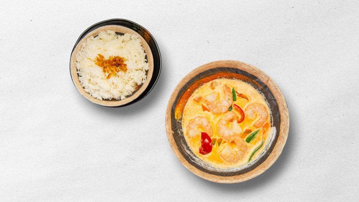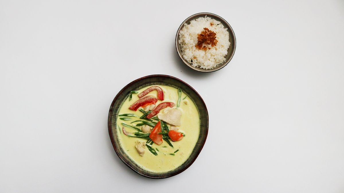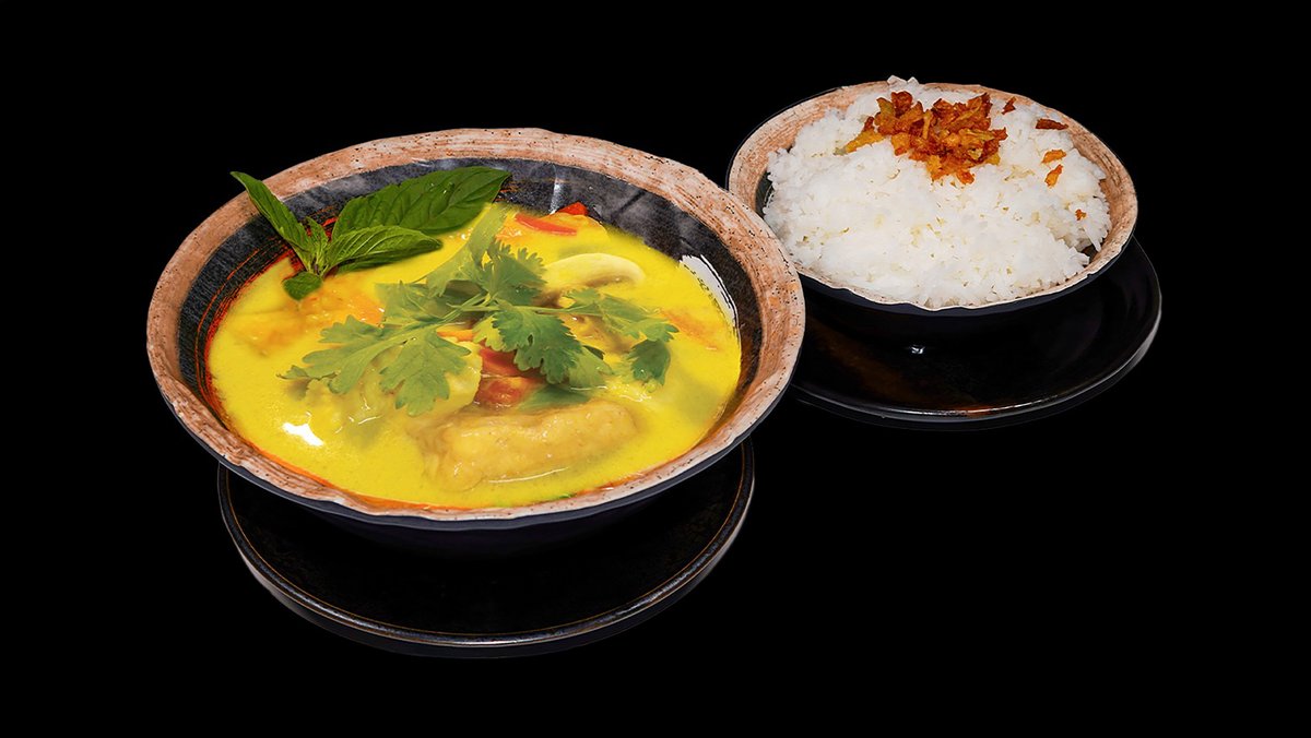 Žlutá kari pasta, kokosové mléko, červená cibule, brambory, smetana, fazolové lusky, bazalka, koriandr a maso dle výběru s rýží.