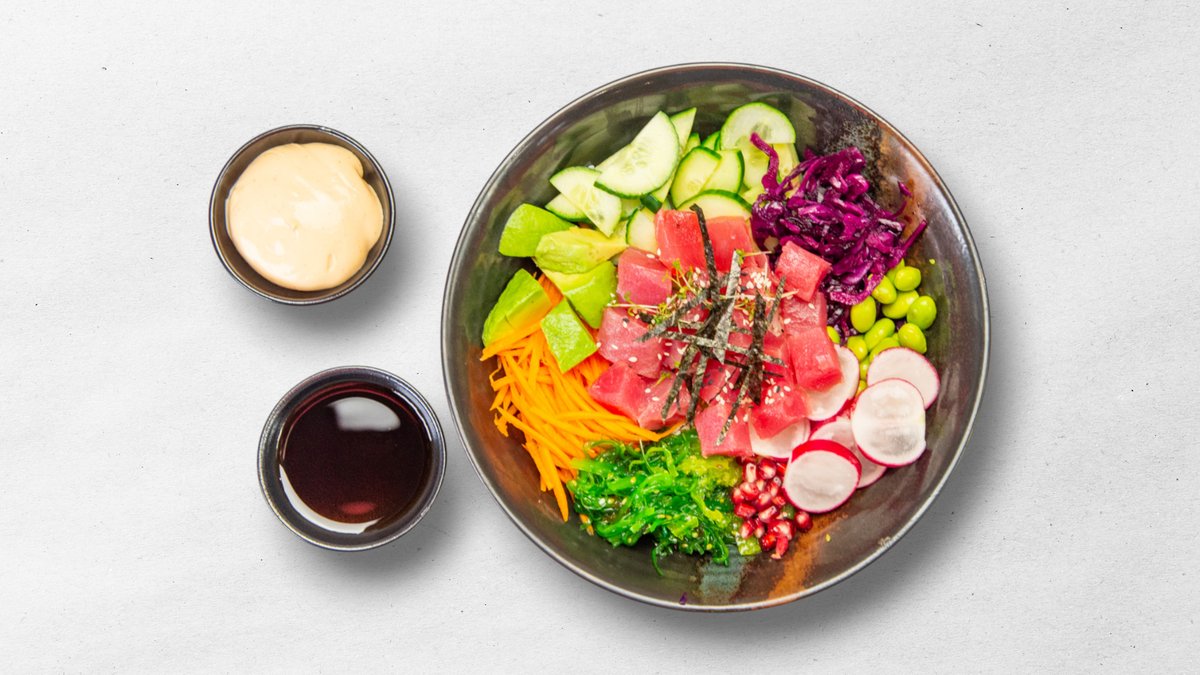 Jasmínová rýže, wakame, mrkev, okurka, avokádo, edamame, ředkvičky, granátové jablko, sezam a řasa nori. Podáváme se sójovou omáčkou a domácí chilli majonézou.