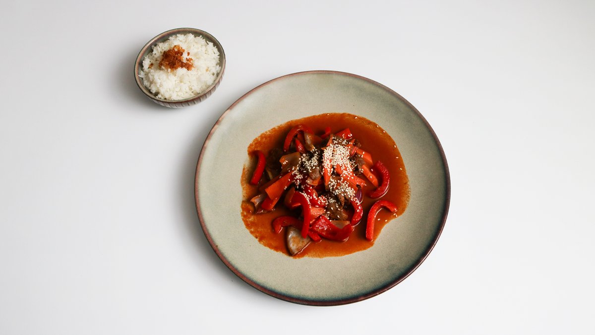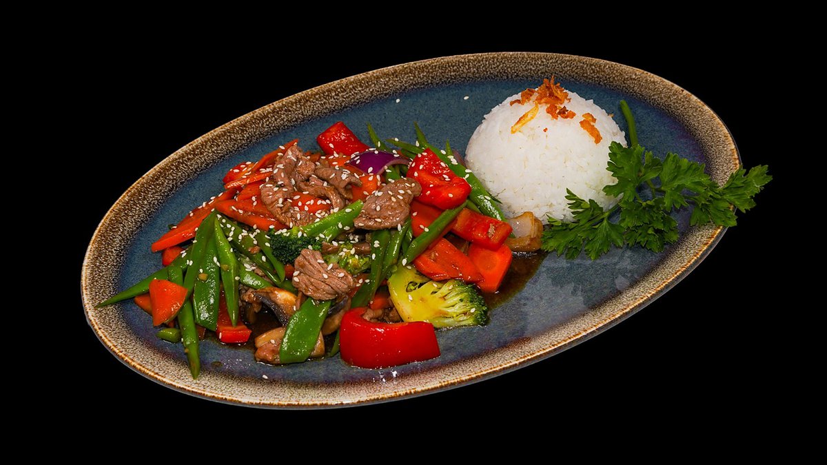 Restované maso, chilli, citronová tráva, cibule, paprika, mrkev, sezam a maso dle výběru s rýží.