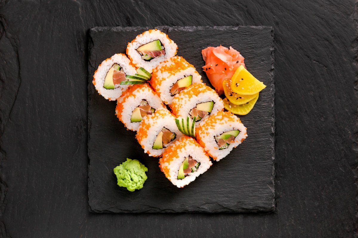 Tuňák, avokádo, tobiko, mořské řasy a rýže.
