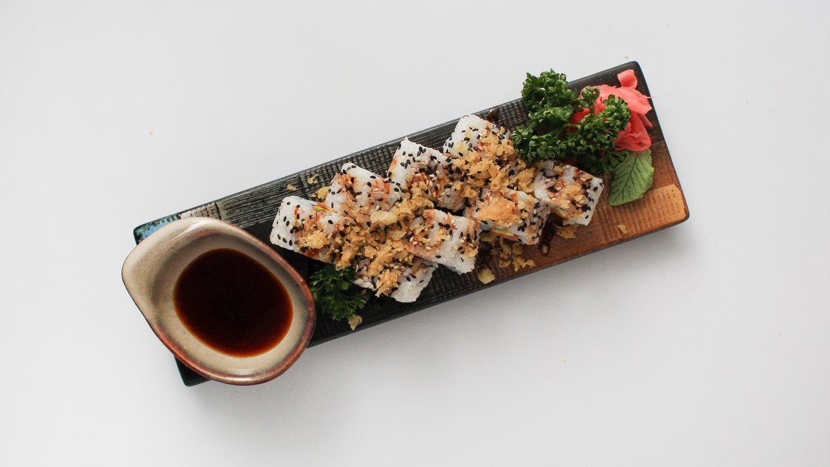 Tempura krevety, avokádo, tobiko, mořské řasy, rýže a unagi omáčka.