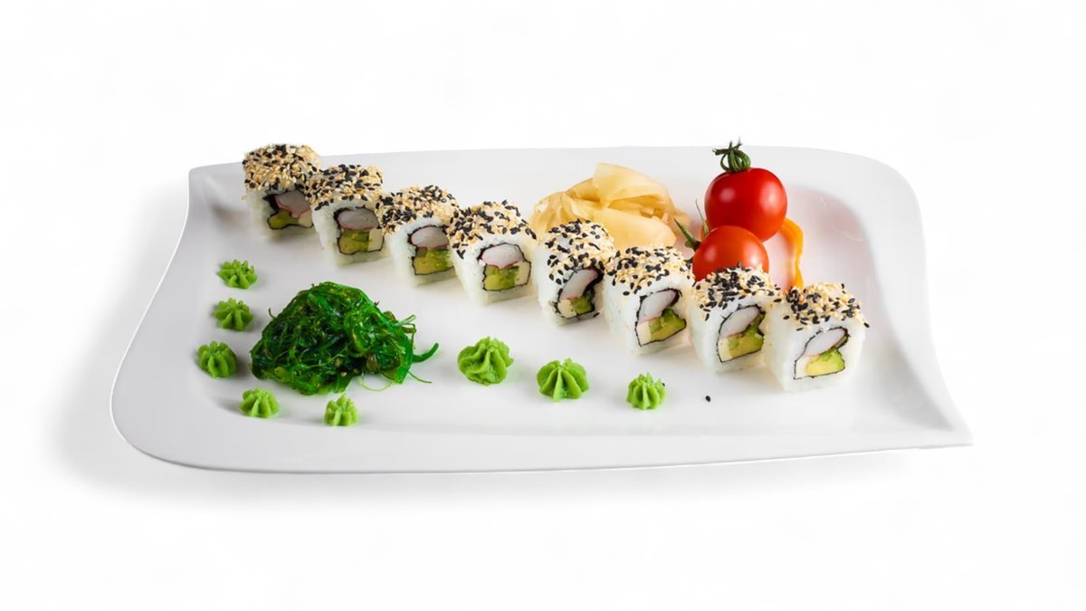 Tofu, avocado, okurka, sýr, sezam, cibule, wakame salat unagi, sněhová omáčka a kaviár.
