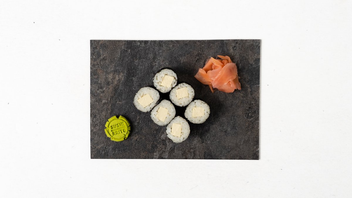 Uvnitr: sýr, tofu, avokádo a okurka. Venku: wakame salat, cibule, sezam, unagi a snehova omáčka.